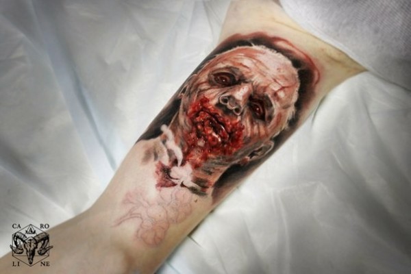 大臂内侧彩色恐怖风格恶心的血性人脸纹身图案