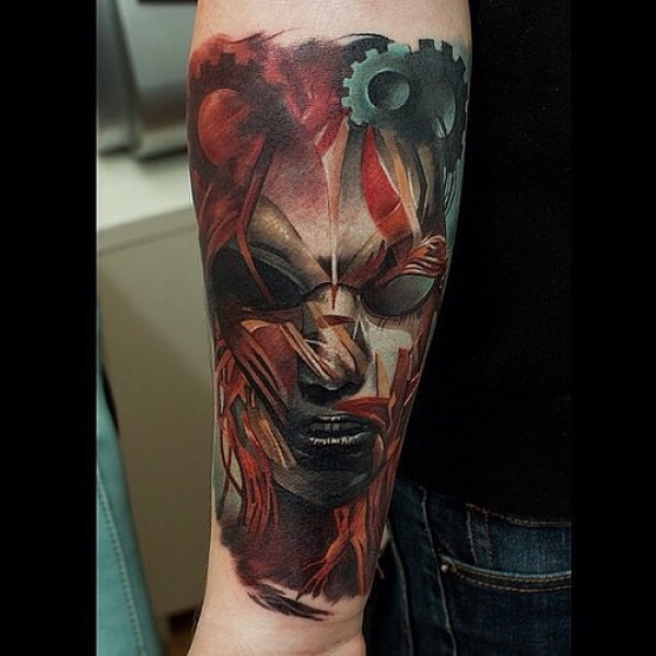 小臂彩色令人毛骨悚然的女人脸纹身图案