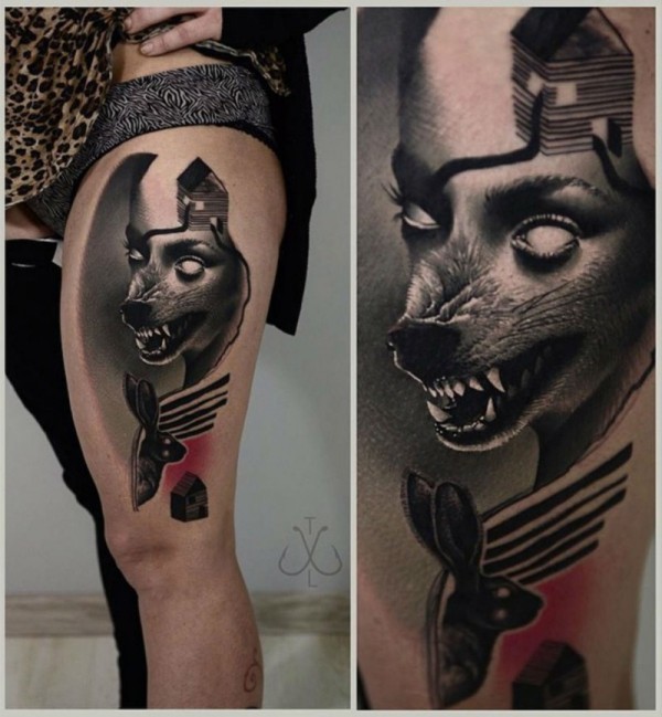 new school大腿上令人毛骨悚然的恶魔狼纹身图案