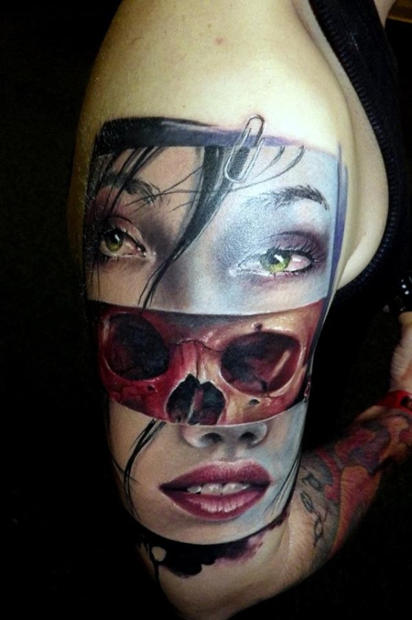 有趣的结合女性肖像与骷髅彩绘纹身图案