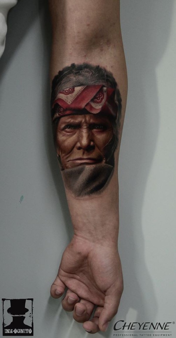 小臂现实主义风格的彩色印度人肖像纹身图案