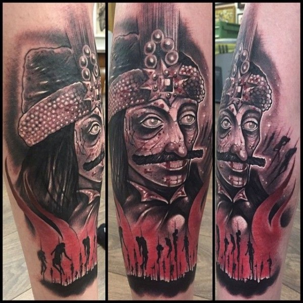 腿部彩色死亡人和男子脸部肖像纹身图案