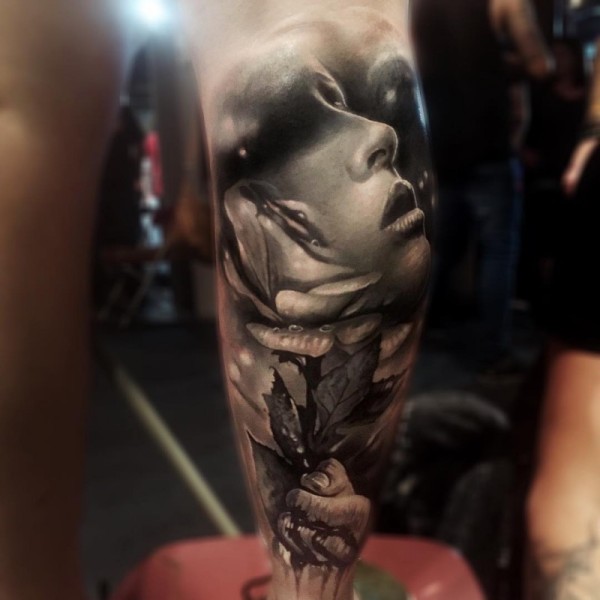 小腿彩色玫瑰手女性肖像纹身图案