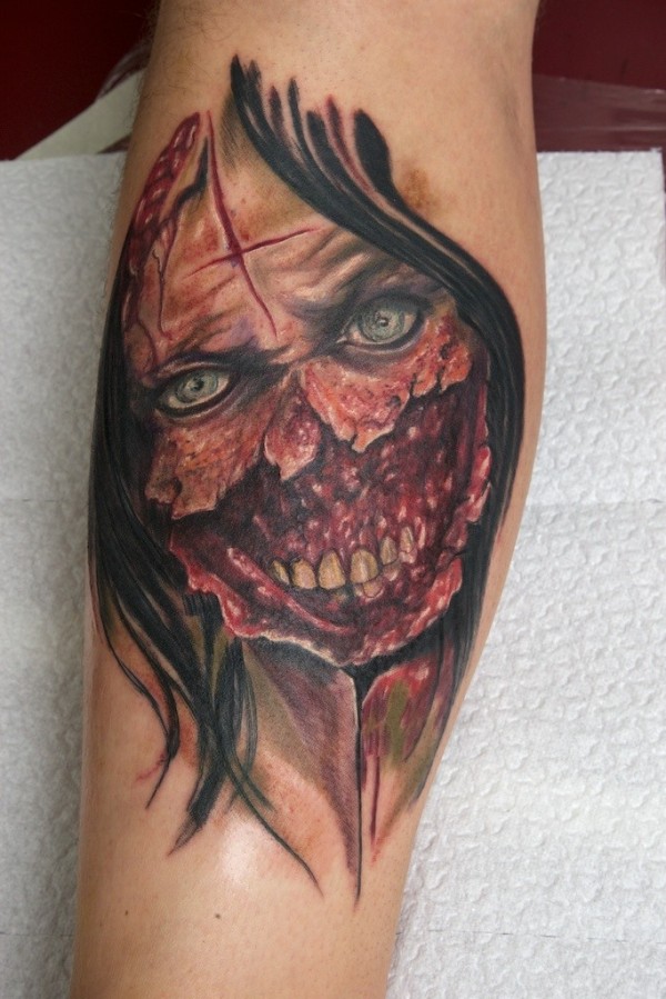 彩色恐怖风格令人印象深刻的僵尸脸纹身图案