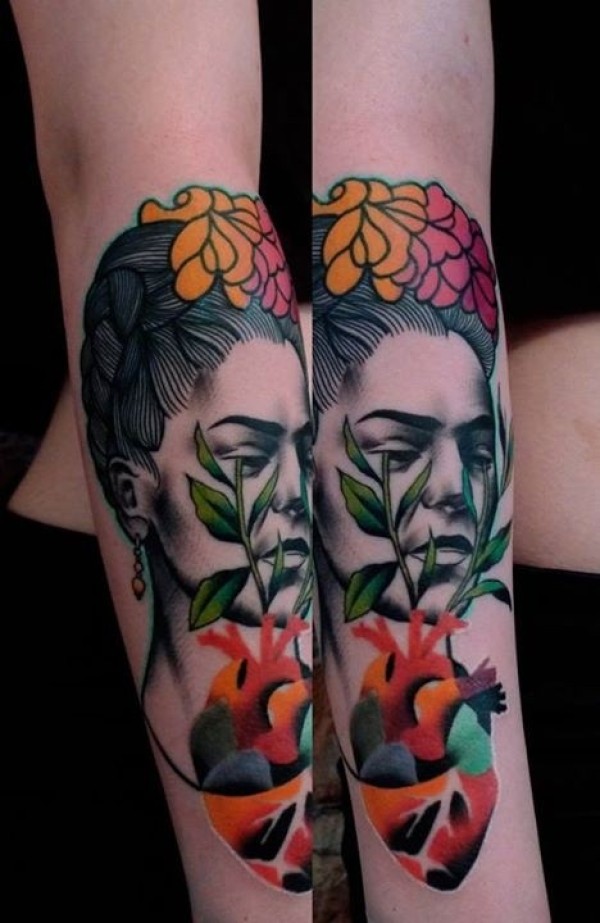 new school彩色手臂妇女脸与鲜花纹身图案