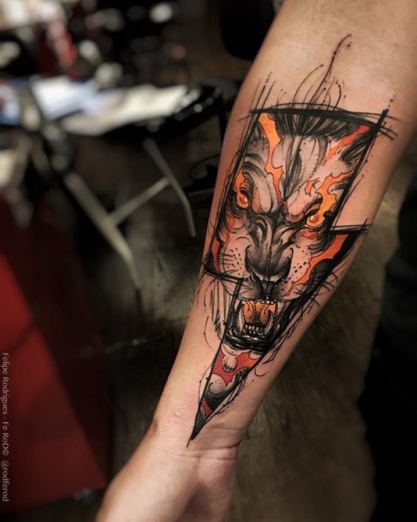 小臂闪电式彩色恶魔的狮子脸纹身图案