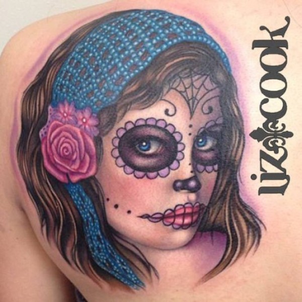 背部典型的墨西哥传统风格彩色女人脸纹身图案