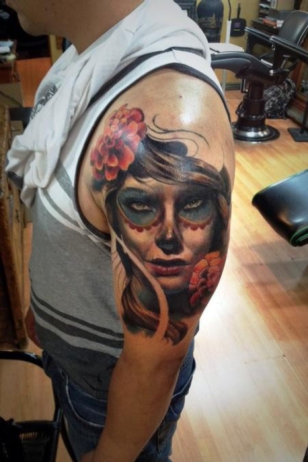 墨西哥传统的彩色女人肖像和花朵纹身图案