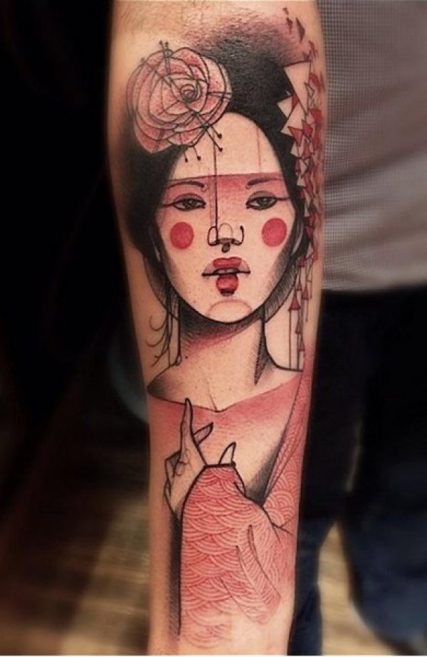 小臂素描风格的彩色艺伎和花朵纹身图案