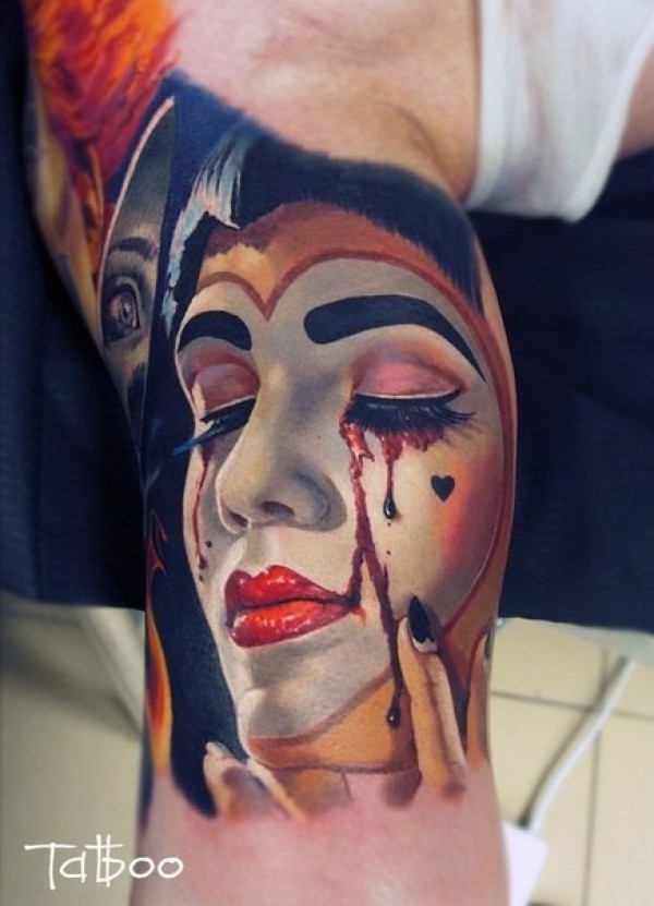 惊人的现实主义风格流血哭泣的女小丑纹身图案