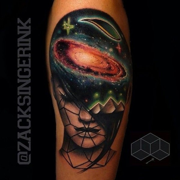 超现实主义风格的彩色女子肖像头部星空组合纹身图案