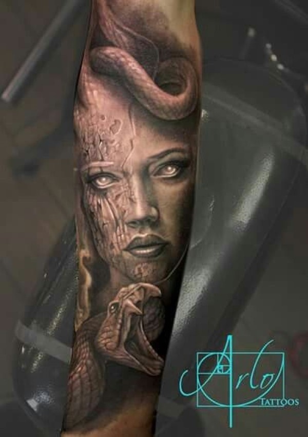 手臂神秘的人像裂面和狂怒的蛇纹身图案