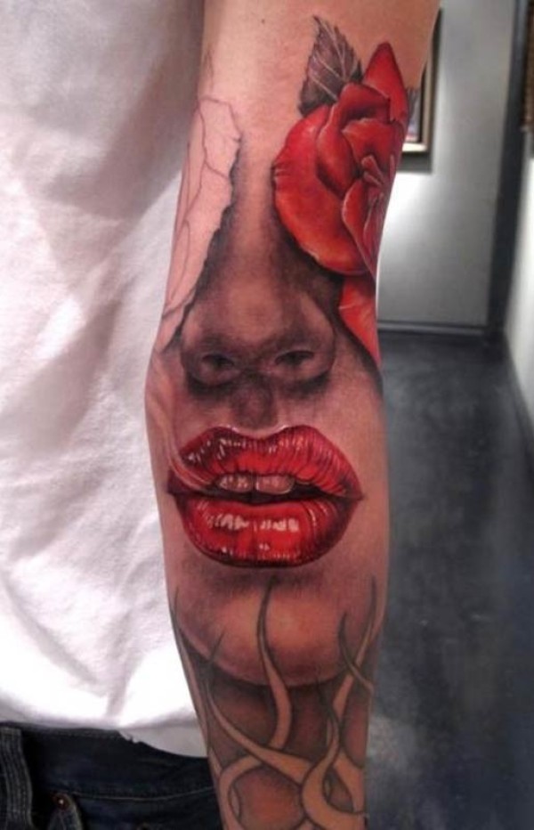 手臂美妙的半女子脸与红色嘴唇玫瑰纹身图案