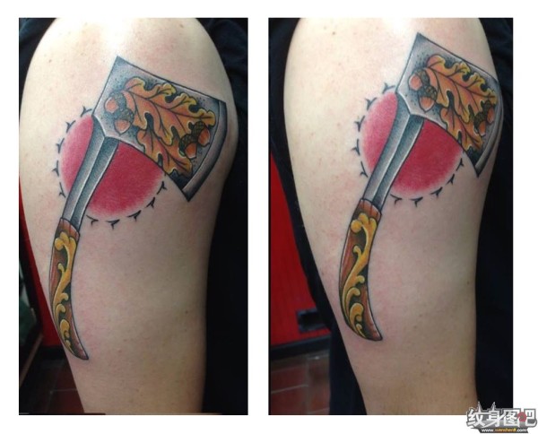 大臂上一把木柄斧头