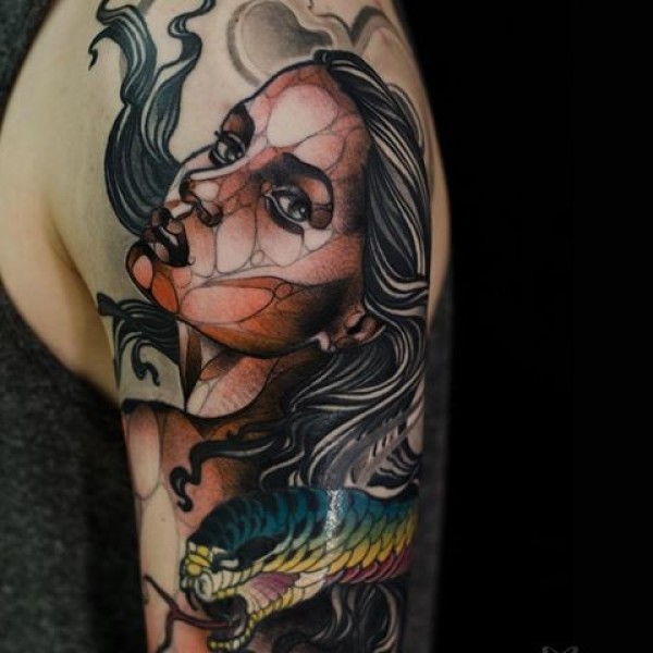 大臂彩绘女郎头像和五彩蛇纹身图案