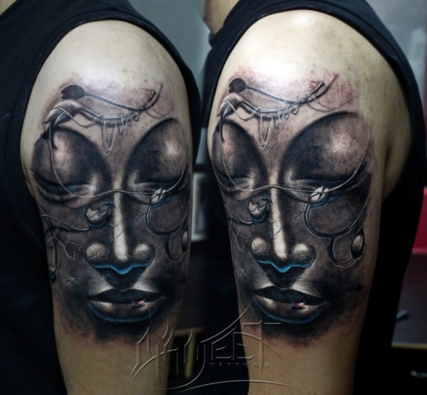 大臂彩色肩膀令人印象深刻的女性面具纹身图案