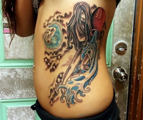 女生侧肋彩色女人水瓶座月亮和星星纹身图案