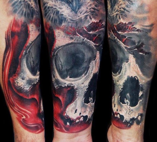 new school风格彩色血腥骷髅与羽毛纹身图案