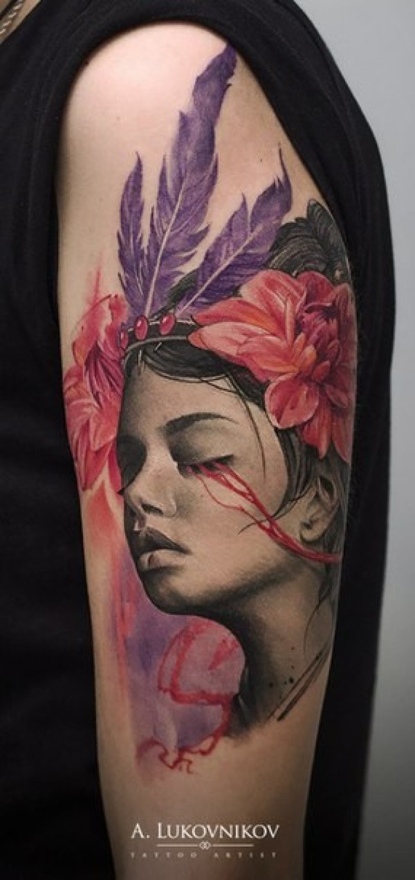 大臂写实惊人的女生肖像与鲜花羽毛纹身图案