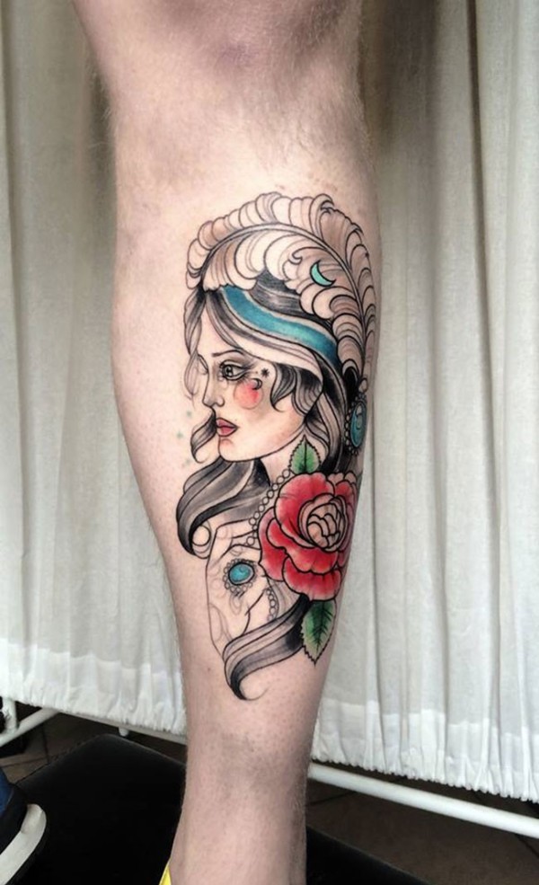 小腿素描风格的彩色女郎与羽毛和玫瑰纹身图案