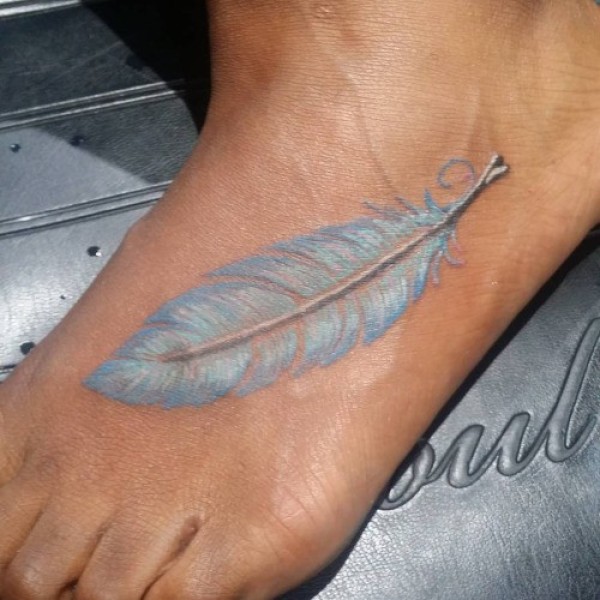 脚背上传统的白色羽毛纹身图案