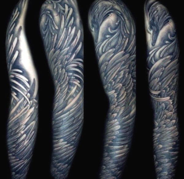 胳膊不寻常的彩色大量羽毛翅膀纹身图案