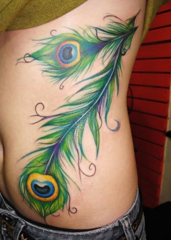 侧肋精彩的绿色孔雀羽毛纹身图案