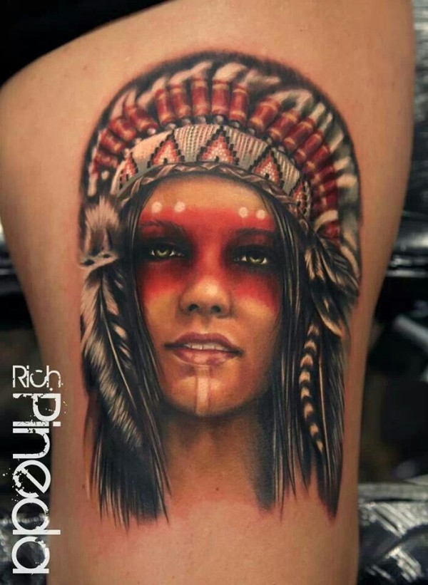 大腿写实肖印度女子羽毛头盔纹身图案
