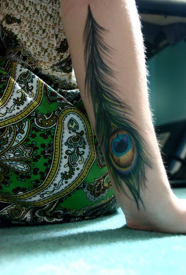 小臂华丽的现实主义风格孔雀羽毛纹身图案