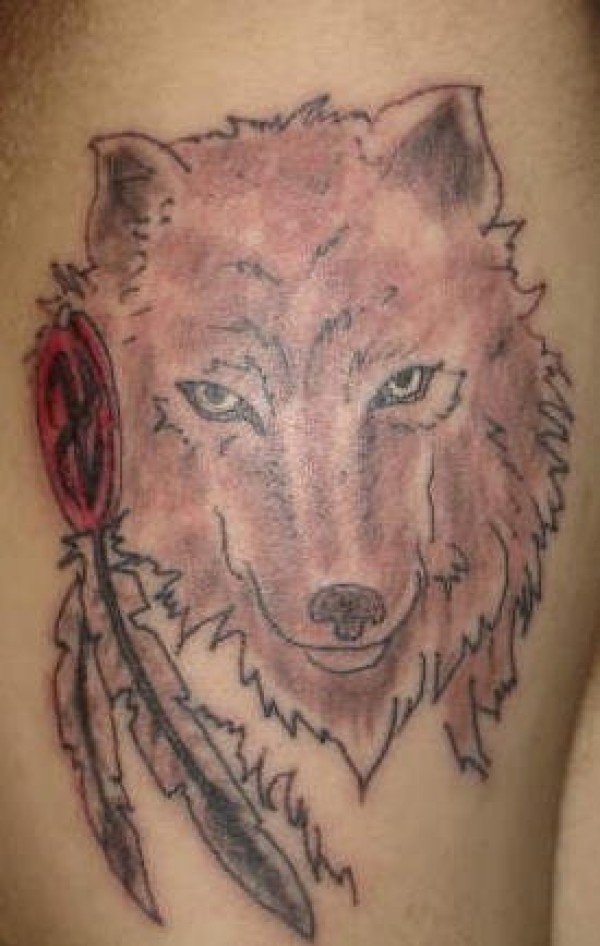 漂亮的狼与羽毛纹身图案
