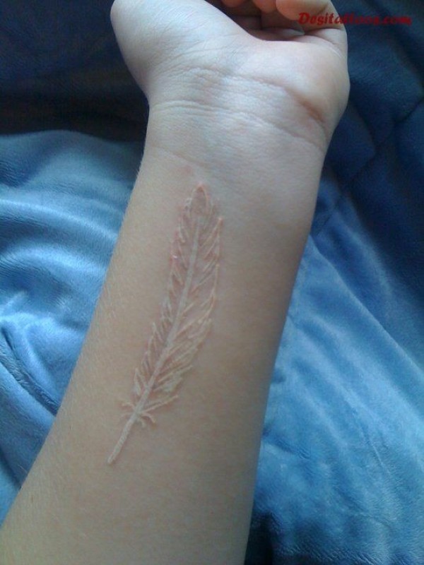 手腕上长长的白色轮廓羽毛隐形纹身图案