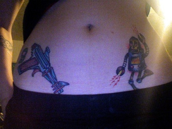 腰部消防机器人与枪支纹身图案