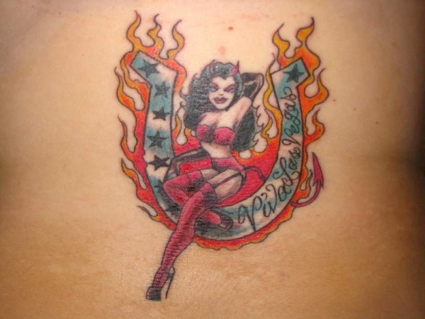 女吸血鬼坐在马蹄铁与火焰彩色纹身图案