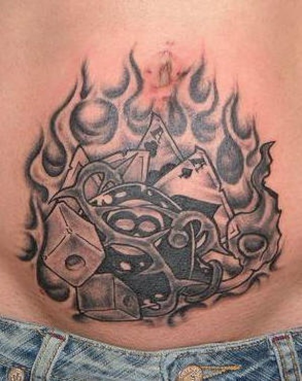 腹部黑灰骰子扑克牌火焰纹身图案