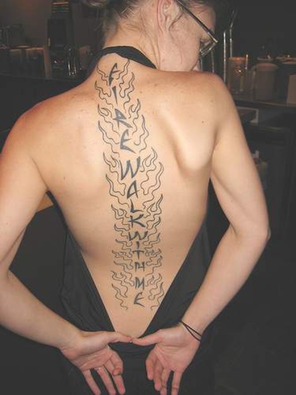 性感女性背部脊椎处个性火焰线条与字母纹身图案