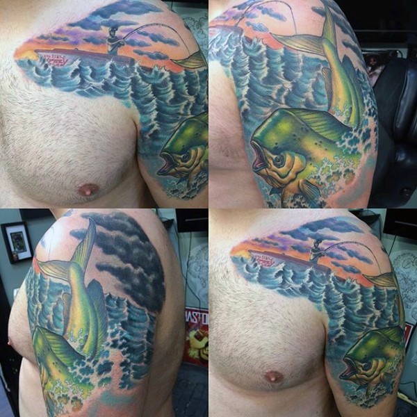 男性肩部海浪大鱼和渔船纹身图案彩色