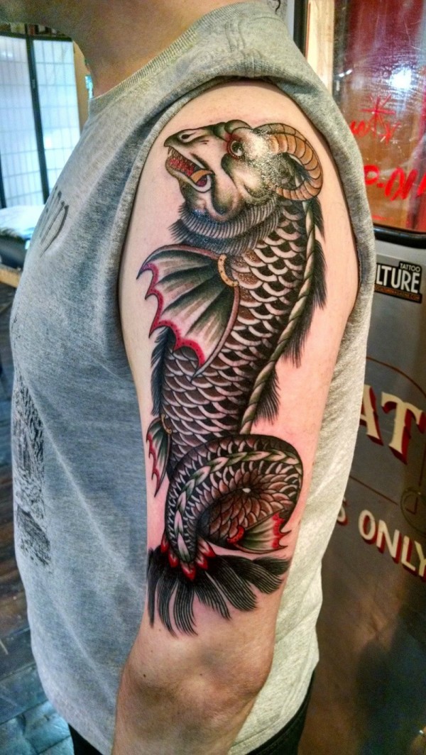 new schoo大臂羊头鱼身怪异个性的纹身图案