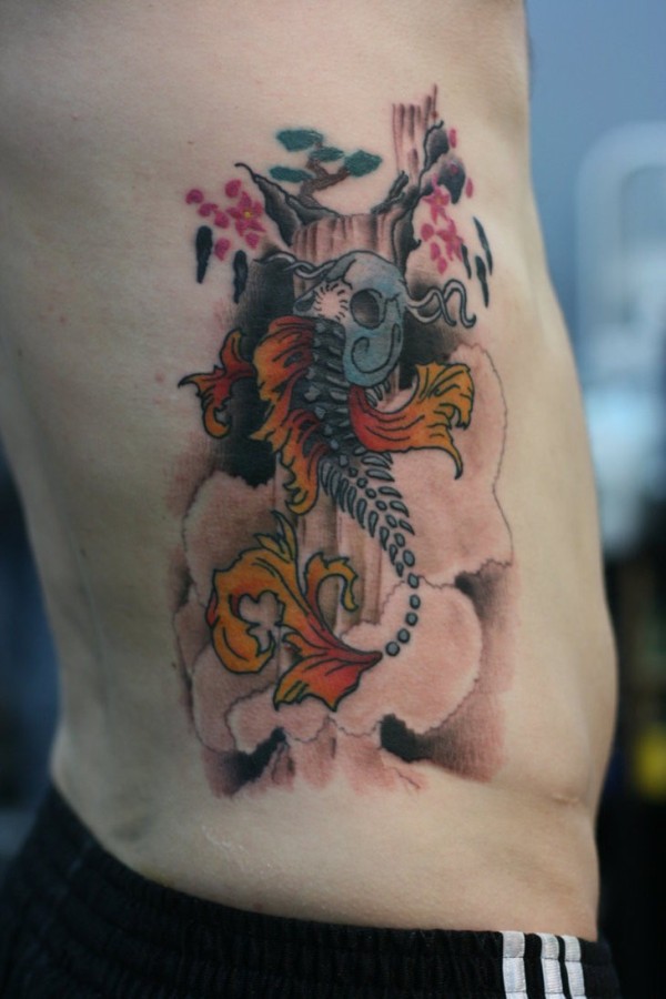 侧肋new school彩绘鱼骨架和树花卉纹身图案