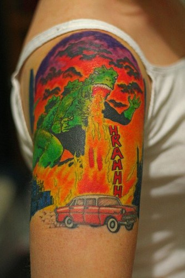 大臂卡通彩绘哥斯拉喷火和汽车纹身图案