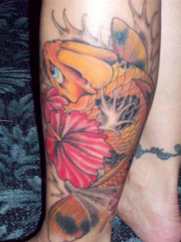 腿部彩色芙蓉和锦鲤鱼纹身图案