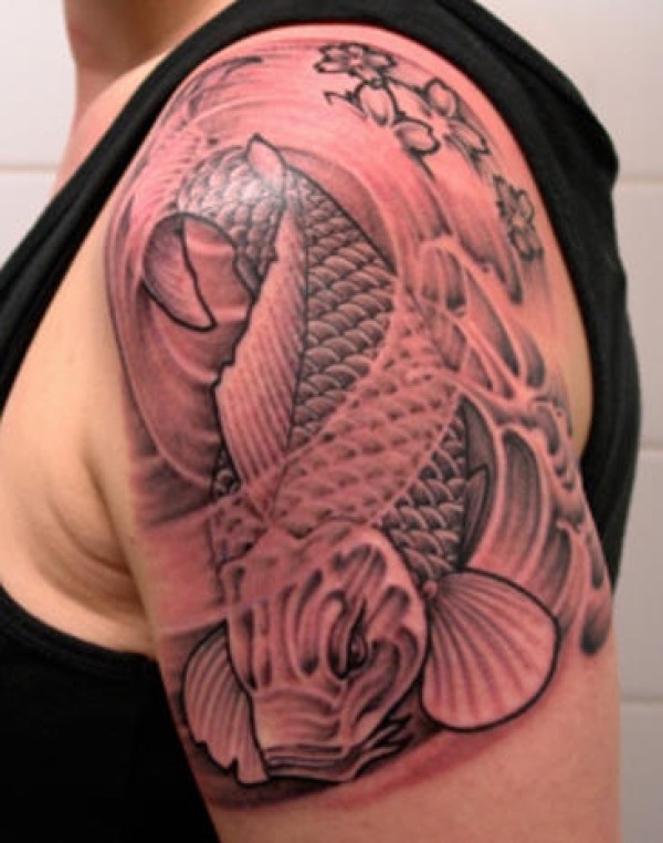 肩部鲤鱼与花朵纹身图案