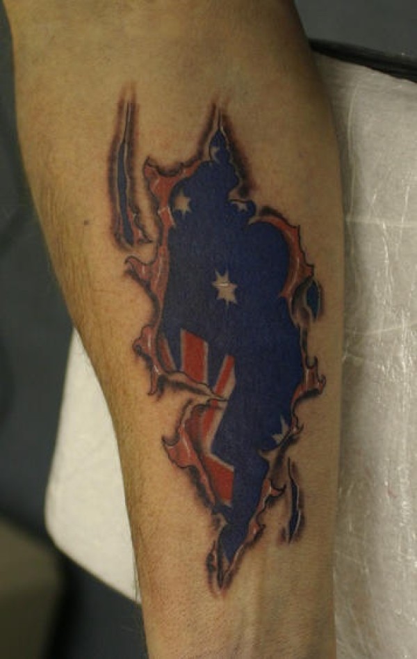 手臂澳大利亚国旗下的皮肤撕裂纹身