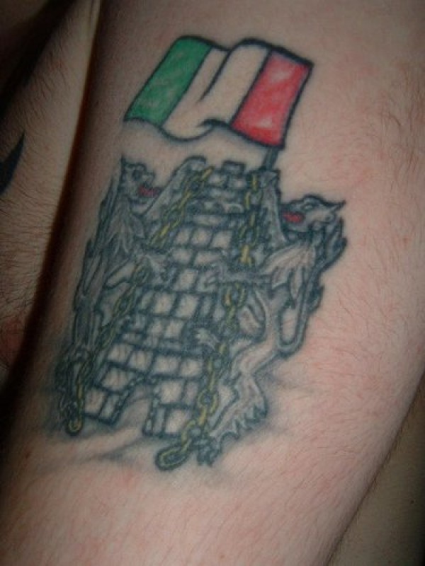 腿部彩色爱尔兰城堡上的狮子旗纹身