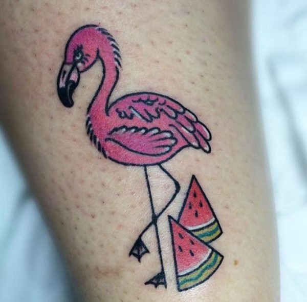 腿部彩色自制的卡通火烈鸟和西瓜纹身