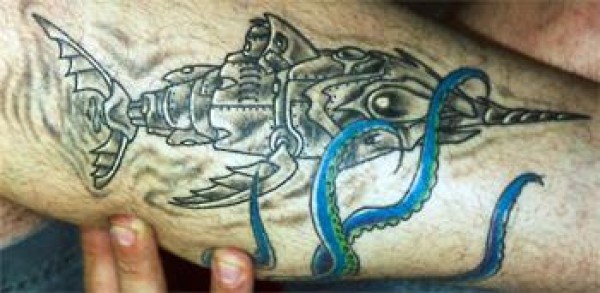 男性手臂彩色剑鱼纹身图案