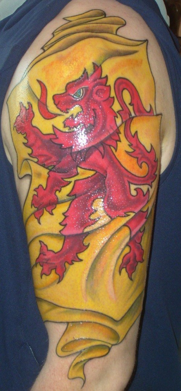 肩部彩色黄色旗帜与红色狮子纹身