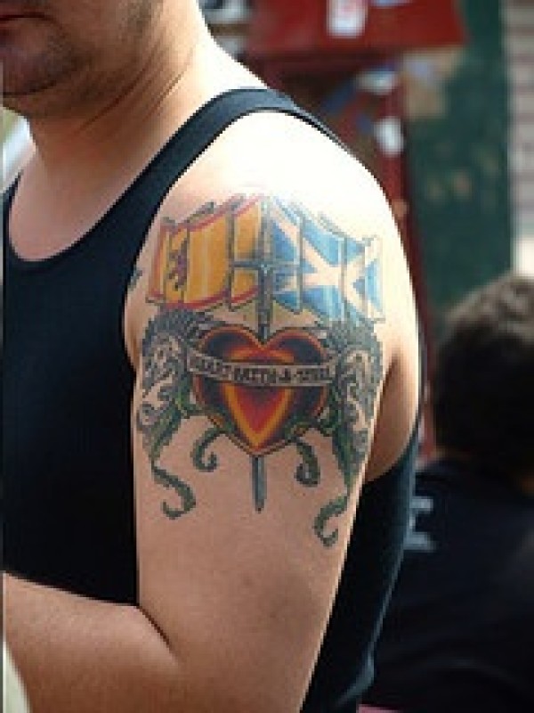 肩部彩色西班牙和苏格兰旗纹身
