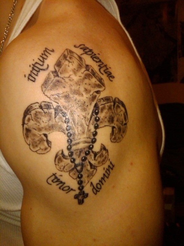 肩部灰色石雕风鸢尾与十字架纹身图案