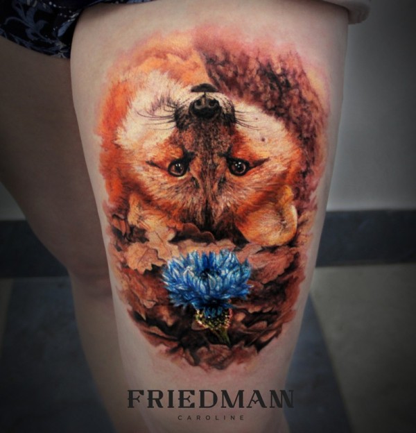 腿部彩色逼真的狐狸与花朵纹身图案