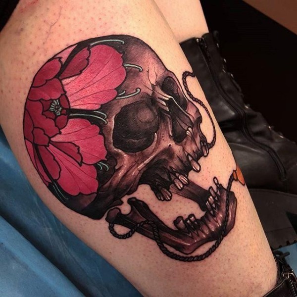 腿部新风格彩色人头骨与花纹身图片